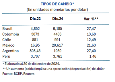 Al 30 de diciembre, las principales monedas de la región se depreciaron a un ritmo de dos dígitos. El real brasileño aumentó 27,47 por ciento, el peso mexicano lo hizo en 21,83 por ciento, el peso chileno en 12,49 por ciento y el peso colombiano en 13,68 por ciento.