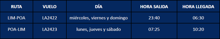 Porto Alegre, una ruta que se estima alcance los 45 mil pasajeros transportados en su primer año, se convierte en el quinto destino en el Brasil hacia donde opera LATAM Perú que actualmente mantiene operaciones directas hacia Brasilia, Curitiba-Lima, Río de Janeiro y São Paulo.